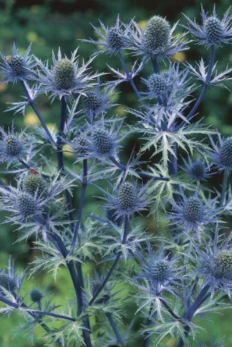 A spiky perennial with stunning silver-veined leaves and thistle-like blue flowers held on vivid blue, 50cm tall stems from June to August.