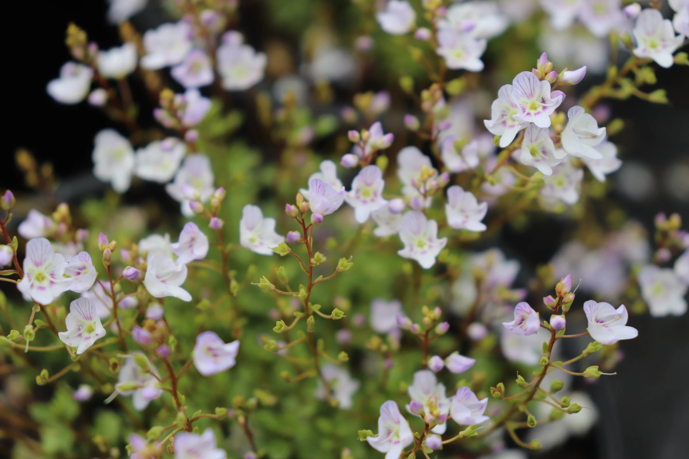 A small evergreen shrub to 20cm. White flowers with red markings cover the plant from June to September. The flowers contrast well with the serrated glossy leaves. A great plant for the front of a border, in a rockery or a pot.