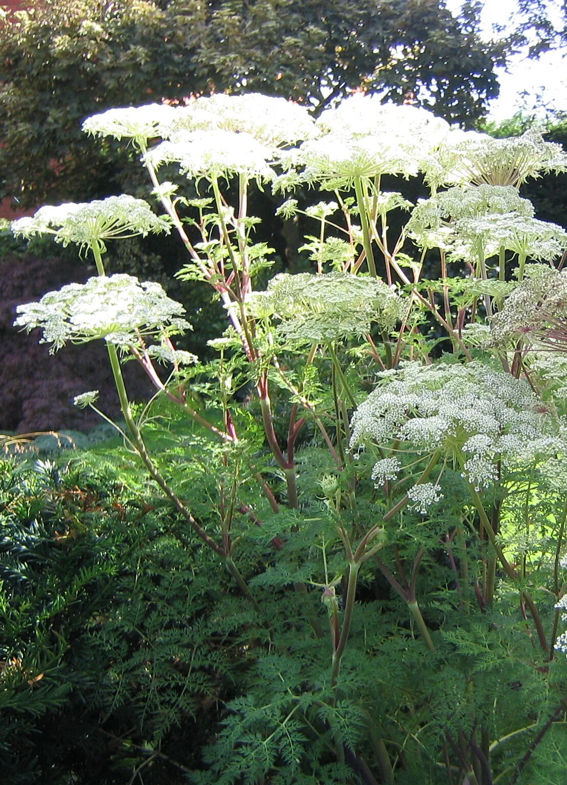 A great plant which looks stately and delicate at the same time. The large, broad umbels of flowers are held on thick, 120cm tall stems, well above the delicate-looking fern-like foliage. The small white flowers appear from August to September, turning into beautiful seed heads which can be admired throughout the winter. The leaves appear late in spring, so don’t be alarmed if it hasn’t come up when other plants are already above ground.