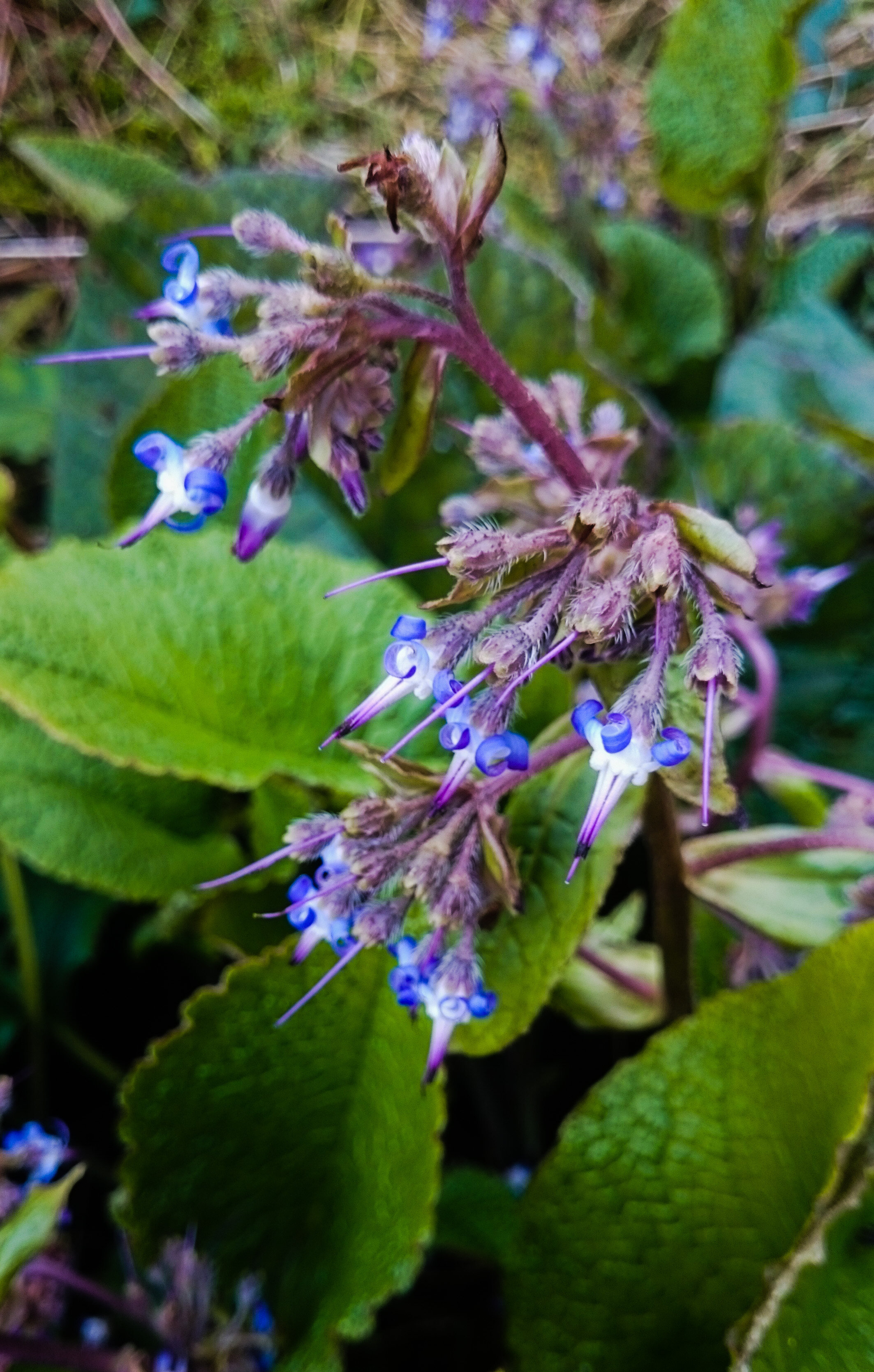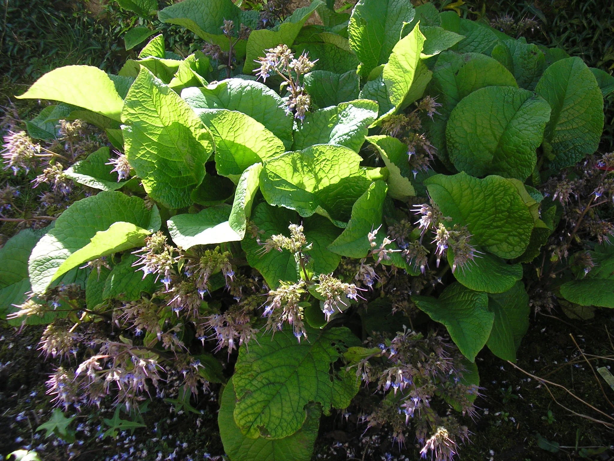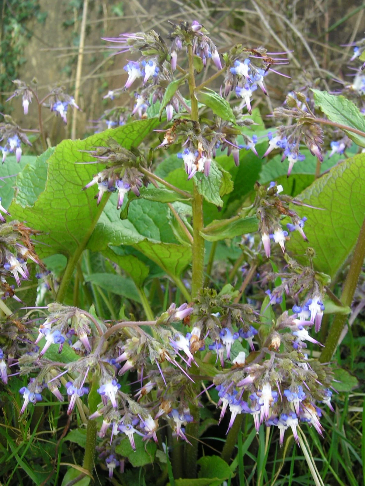 A spreading, shade-loving plant with large, rough, overlapping leaves providing a great ground cover. Before the leaves appear, sky-blue flowers appear from March to May on 40cm, brownish-red stems.